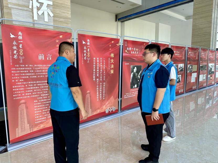 在淄博市高青县科技馆,馆长张忠带领宣讲团参观了由山东省科协、中共海北州委宣传部、青海原子城纪念馆共同主办展出的“两弹一星”精神永放光芒——中国原子城历史图片展。展览现场,百余幅珍贵历史照片系统展现了中国核武器研制的艰辛历程,青年宣讲员认真聆听讲解,仔细观看展板,不时驻足记录。